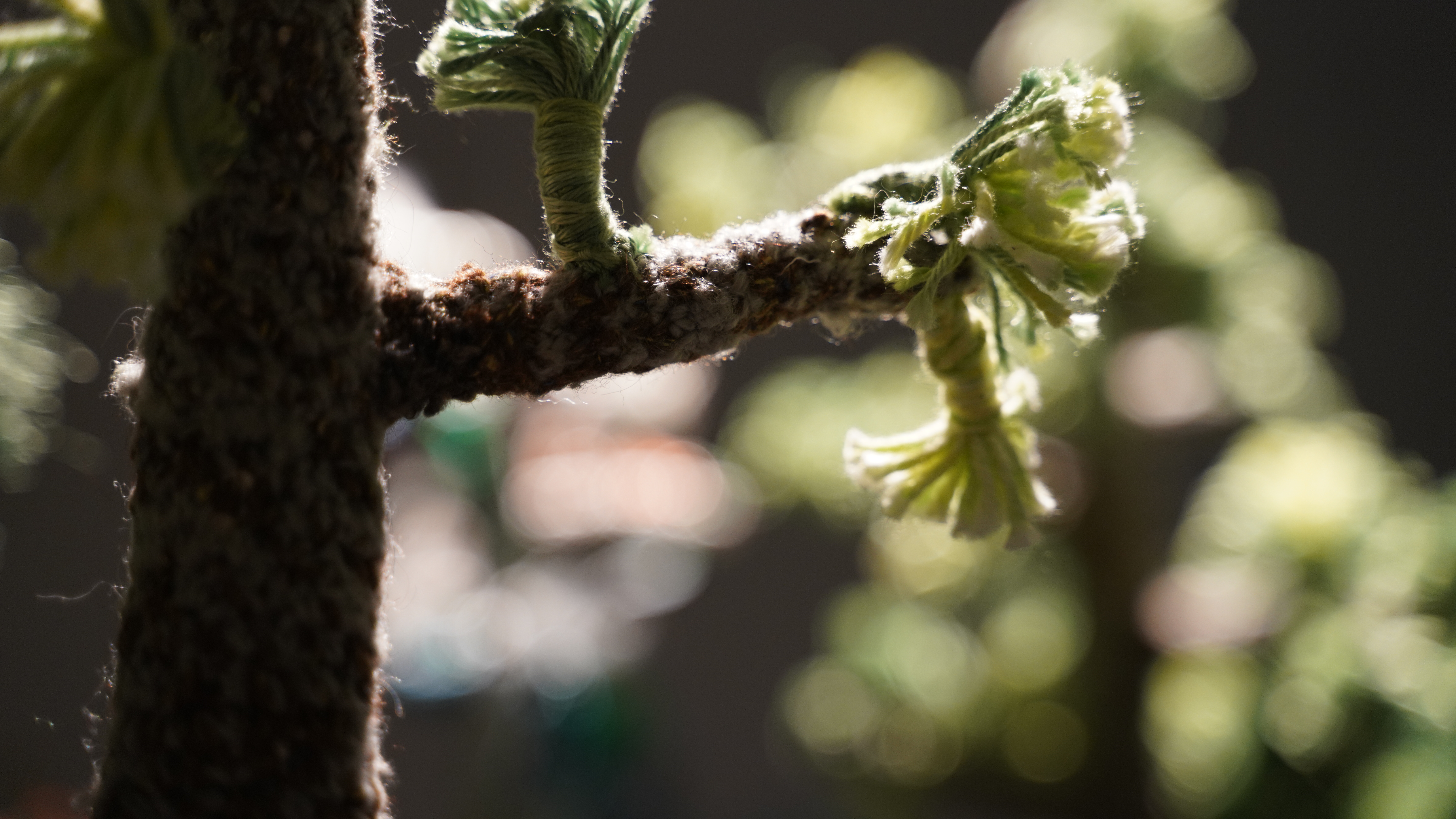 In the exhibition at The Nickle Gallery in 2023 the hand-made crocheted trees and their shadows filled the gallery space. Grouped together in the gallery, they became approachable and intimate objects with a plush, almost stuffed animal feel at a scale that is relatable. Accompanying the trees was a large scale video projection and ten large format photographs that show the trees in situ in both Scotland and BC. Serving as stand-ins for what would have grown in the area – whether larch or rowan, ponderosa pine or aspen – the crocheted wool trees read both as specific species and as trees in general. The plastic trees also have another register—they remain alien looking, intentionally toxic or a little ghostly.