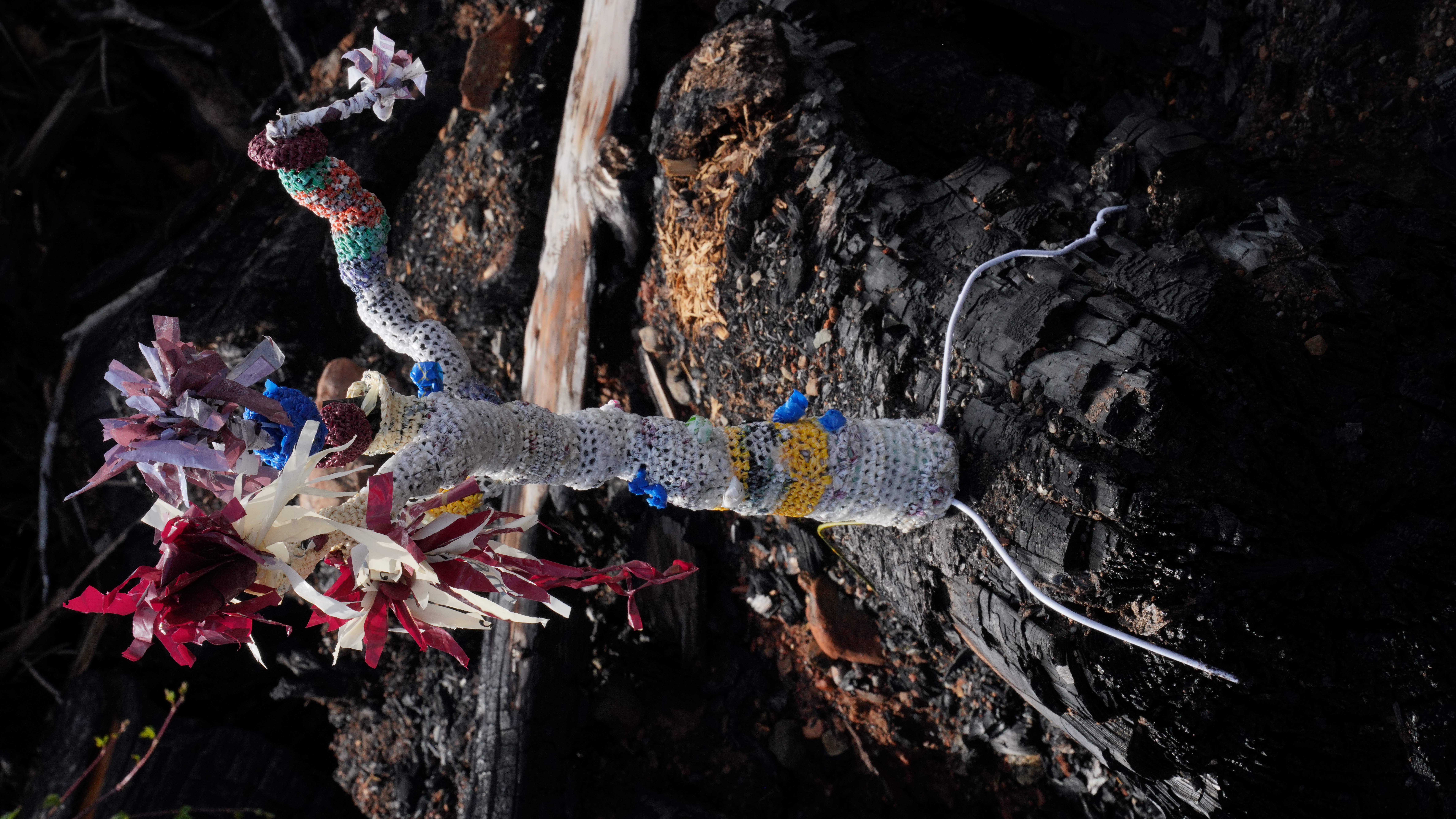 Treelines - here and there is an ongoing installation series of cocheted trees and large format photographs and video projections shot in locations in Scotland and British Columbia. The project is meant to provoke questions and thoughts about land use, the legacy of colonialization and our collective relationship to land in a time of climate crisis. In the Jordan River version of the project MacGregor traveled with members of the Broken Forest Eco Art Group to work in a clearcut in Jordon River on Vancouver Island. Each artist created a site-specific artwork in the clearcut that was shared in a public presentation and at the Legacy Gallery in Victoria. MacGregor placed a selection of the crocheted trees inside a slash burn pile to be viewed in person as well as in photographs. Photographs and videos of the installation will be incoporated into future version of the Treelines - here and there project.