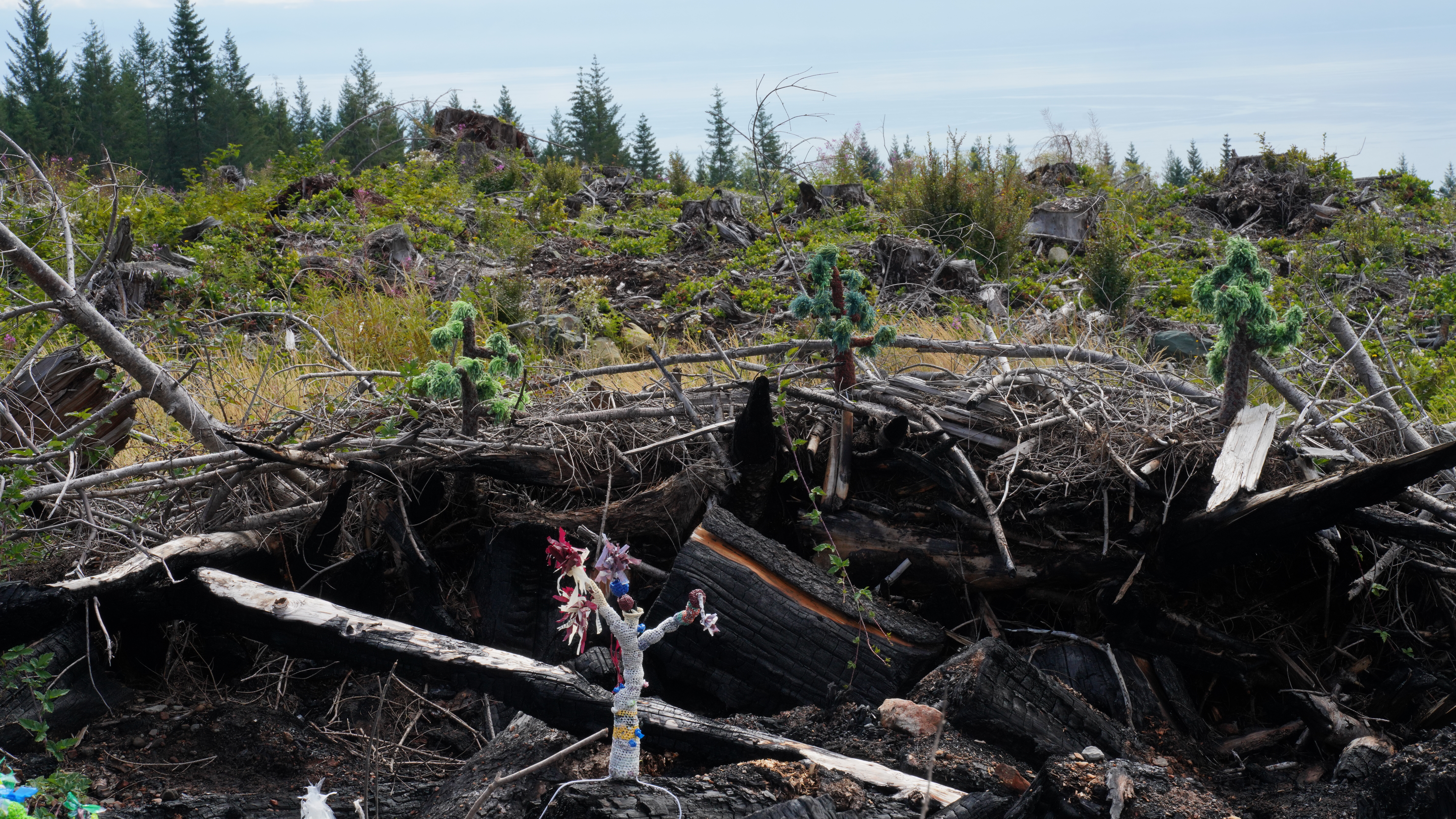 Treelines - here and there is an ongoing installation series of cocheted trees and large format photographs and video projections shot in locations in Scotland and British Columbia. The project is meant to provoke questions and thoughts about land use, the legacy of colonialization and our collective relationship to land in a time of climate crisis. In the Jordan River version of the project MacGregor traveled with members of the Broken Forest Eco Art Group to work in a clearcut in Jordon River on Vancouver Island. Each artist created a site-specific artwork in the clearcut that was shared in a public presentation and at the Legacy Gallery in Victoria. MacGregor placed a selection of the crocheted trees inside a slash burn pile to be viewed in person as well as in photographs. Photographs and videos of the installation will be incoporated into future version of the Treelines - here and there project.